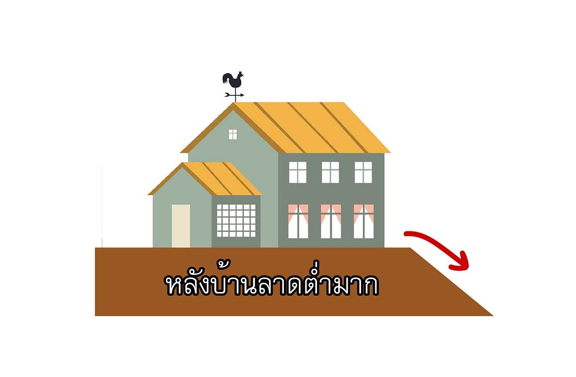 หากพบว่า บ้านมีลักษณะพื้นถนนหน้าบ้านและตัวบ้านระดับใกล้เคียงกัน แต่หลังบ้านลาดต่ำลงอย่างมาก ฮวงจุ้ยบ้านลักษณะนี้จะพบว่า “บริวารย่ำแย่ การเงินพังพินาศ” เหตุการณ์ลักษณะนี้แทบจะเป็นเกือบทุกหลัง ดังนั้นต้องหลีกเลี่ยงนะครับ