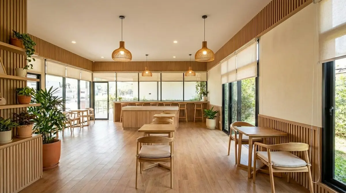 จำลองร้านคาเฟ่ด้วย Ai - เปลี่ยนทิศทางของอาคารด้วยซุ้มประตู "รับกระแส" พลังงานธาตุไม้ส่งเสริมฮวงจุ้ย