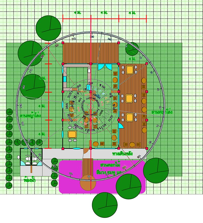 ต้นไม้ใหญ่ที่จะลงปลูกทุกต้นได้รับการวางตำแหน่วงองศาทั้งหมด เพื่อคำนวณการรับแดดในช่วงเดือนแห่งความร้อน มี.ค. ถึ. มิ.ย. ของทุกปี ทั้งตะวันออกและตะวันตกนะครับ